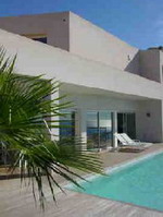This impressive Villa is set high up in an exclusive resort. It faces south and enjoys fabulous views of the Bay and the vast Mediterranean Sea.  Light and spacious in design with a relaxing and airy interior with a neutral colour scheme and high quality furnishings.  The villa has glass windows that go from the ceiling to the floor, and doors which face directly to the sea and allowing sunlight to illuminate through into the villa. Three level villa, with all the rooms laid out in an unbroken line of descent providing excellent views. Luxurious bathrooms. The bedrooms are clean and light.  There is a wooden terrace surrounding the villa (coastal side) leading to and surrounding the large "horizon" pool, which appears to drop away into the sea. There is a standalone cottage which also has a nautical theme with its sundeck shaded by a kite-like structure not unlike the sail of a yacht.